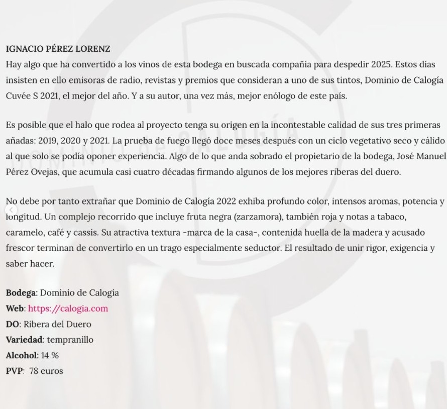 “Si se desea seguir el camino hacia una mayor profundidad y complejidad, una excelente propuesta es Dominio de Calogía, bodega fundada por José Manuel Pérez Ovejas hace unos años. Que ahora se encuentre entre las mejores bodegas no se debe en absoluto a la casualidad, sino a su larga experiencia y excelentes viñedos”.
